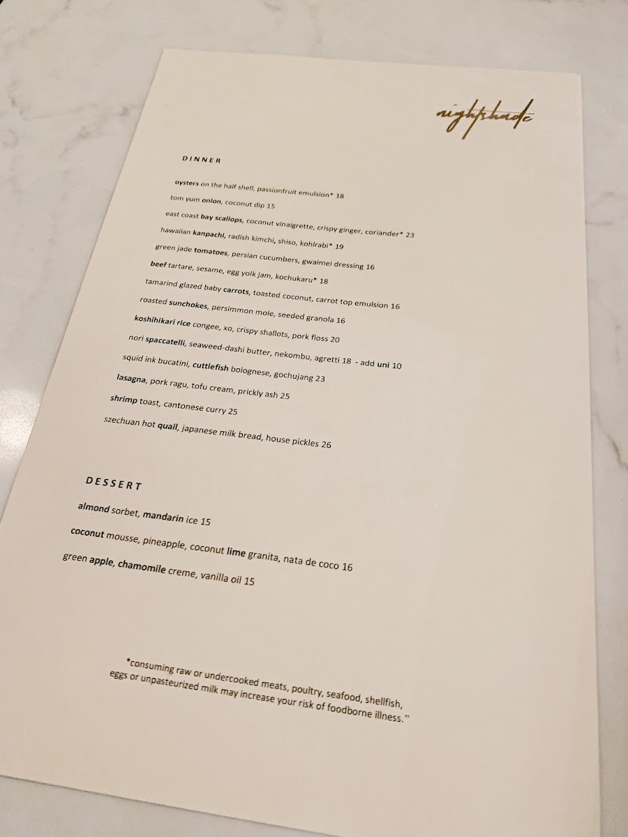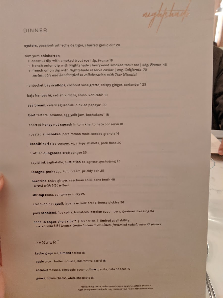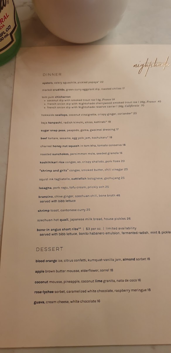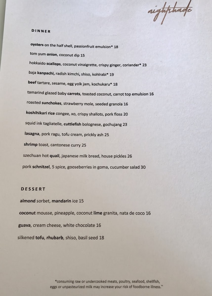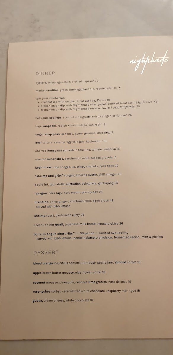 Introducing the menu at Nightshade, located in the heart of Los Angeles, unveils a delightful fusion of flavors that reflects a modern approach to Asian-inspired cuisine. Here, diners can indulge in unique dishes such as Oysters with Passionfruit leche de tigre and Nantucket Bay Scallops dressed in coconut vinaigrette, showcasing the restaurant's commitment to freshness and creativity.